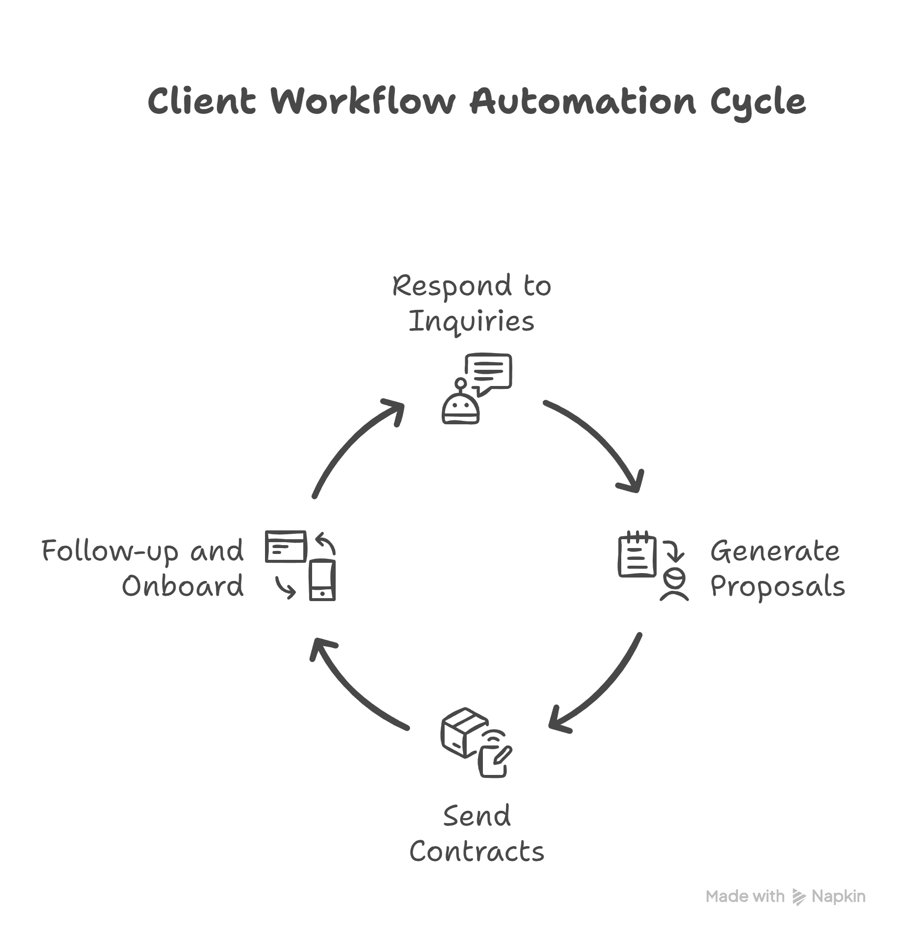 Automates your entire client workflow — from first contact to proposals and onboarding.
